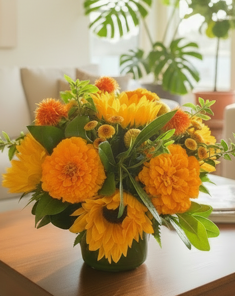 Get ready to smile! This cheerful arrangement bursts with flowers such as sunny sunflowers, golden marigolds, and fluffy mums in bold yellows and oranges. Displayed in a clear glass cube, it ads instant cheer to any home. This size is perfect for an end table or coffee table